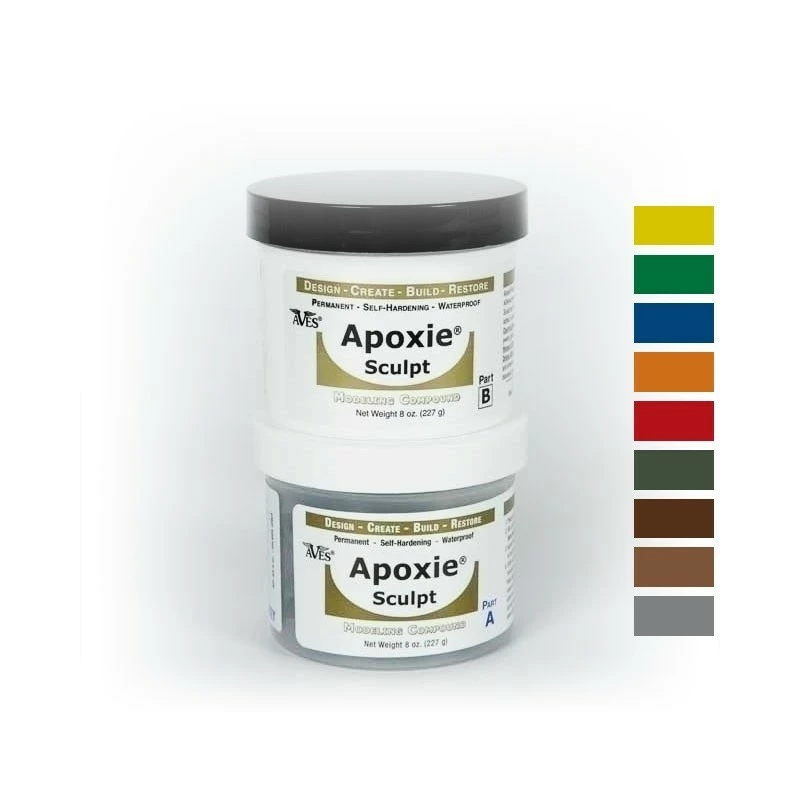 L’apoxie sculpt est une résine bicomposante de couleur qui sèche à l’air. Facile à prendre en main, elle se comporte comme du mastic. Une fois les deux parties mélangées, le temps de travail et de 2 à 3h. Le durcissement total est atteint au bout de 24h. Peut etre lissé au doigt ou avec un outil avant durcissement. Peut être poncé, percé, scié une fois durcis. Adhère à quasiment tout type de surface.