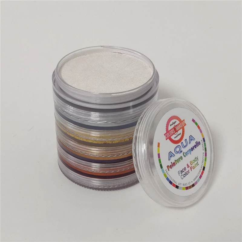 Ces fards humides offrent une couvrance parfaite. Les couleurs sont lumineuses, miscibles entre elles et superposables. Elles s’enlèvent facilement à l’eau claire sur les peaux bien hydratées. Les peaux sèches peuvent nécessiter l’emploi d’un peu de savon. Ces boîtiers s’empilent en se vissant les uns aux autres pour former une ou plusieurs tours pratique pour le transport et l’installation.